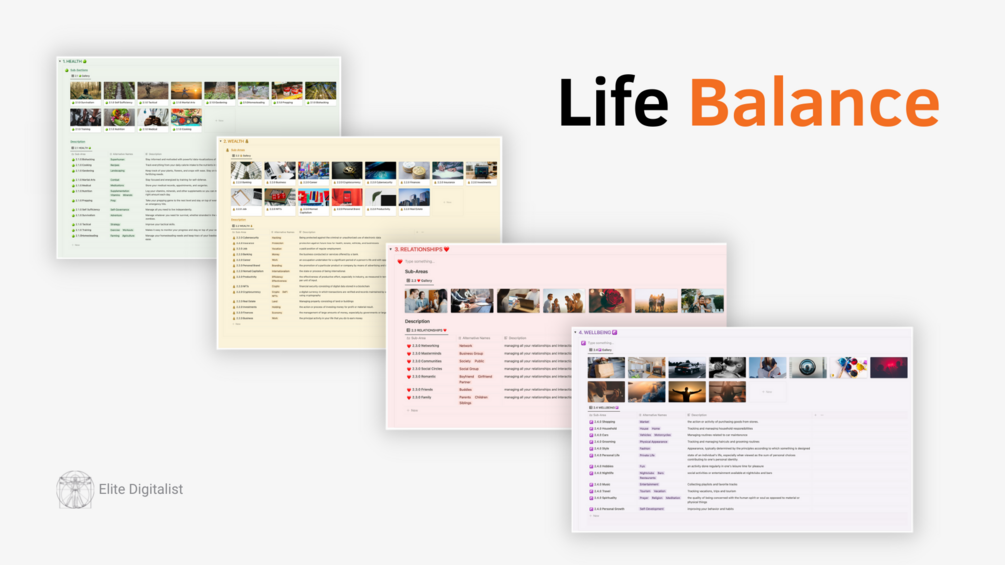 This list is categorized into 4 main life areas, under which you will find a list of sub-areas.