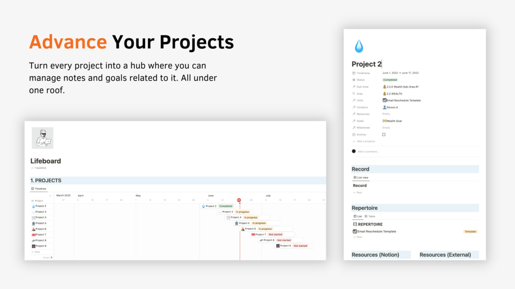 The Lifeboard turns every project into a hub where you can manage notes and goals related to that particular project. It’s all under one roof. The linked databases let you bring together information from around your workspace.