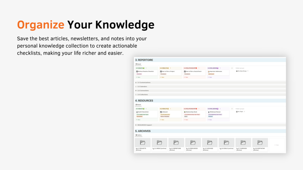Save the best articles, summaries, podcasts, newsletters, and notes into your personal knowledge collection. You will be able to create actionable checklists and templates to make your life richer and easier.
